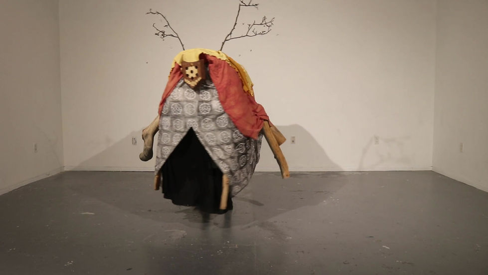 Assorted fabric, found wood, natural dyes, and bells. Puppet constructed for accompanying performance Druantia's Dance.